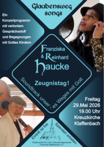 Wenn uns am 29.05.2026 19.00 Uhr das Liedermacherpärchen Franziska & Reinhard Haucke ehre geben, dann wird das ein besonderes Erlebnis. Denn Beide tingelten als selbständige Cocktailband durchs Land, bis sie sich „gerufen“ fühlten und seit dem alschristliche Liedermacher unterwegs sind. „Zeugnistag“ wird mehr als nur ein interessanter Event, es ist ein Bekenntnis zu unserem Herrn und Retter. Kommen Sie und lauschen Sie den Lebensweg von Franziska & Reinhard.