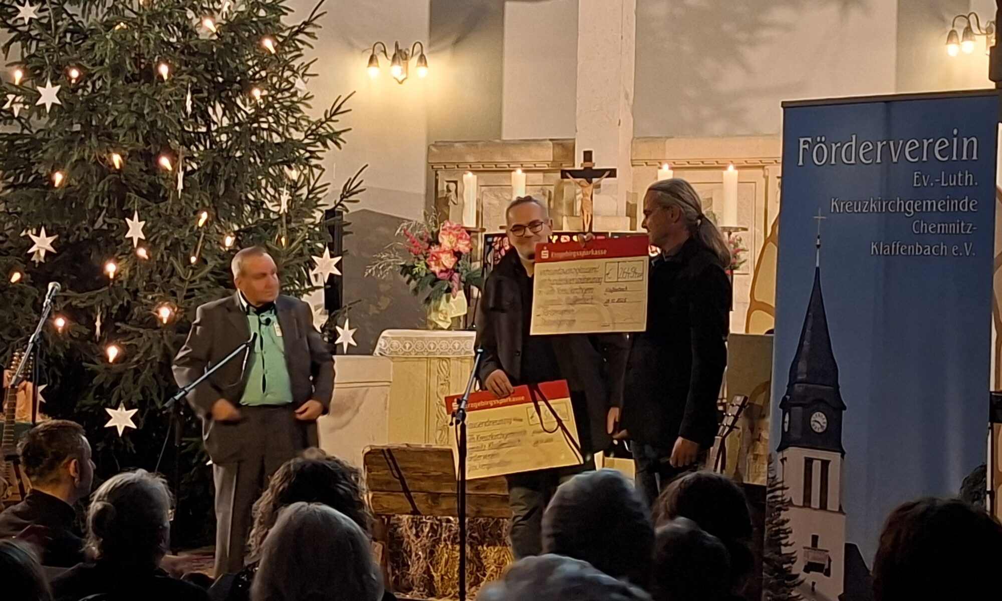 Am Rand des Konzertes wurde dem Pfarrer der Gemeinde, Heiko Wetzig, ein Spendenscheck überreicht. Der Förderverein finanzierte die Generalüberholung einer Kirchentür, mit einem Betrag von 7.400,00 €.