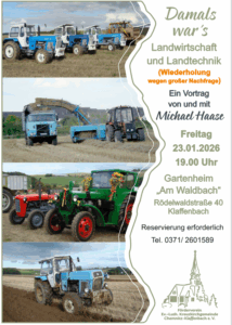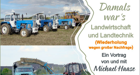 Auf Grund einer großen Nachfrage werden wir diese Veranstaltung nach fast einem Jahr am 23.01.2026 19.00 Uhr wiederholen. Landtechnik und Landwirtschaft der Vergangenheit hat auch heute noch seine Fans. Dieser Event wird von Michael Haase moderiert und findet im Gartenheim „Am Waldbach“ statt. Sichern Sie sich rechtzeitig Ihre Plätze.
