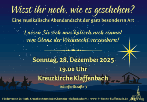 „Wisst Ihr noch wie es geschehen“ hat schon eine gewisse Tradition und bisher immer am 28.12.2025 19.00 Uhr in der Klaffenbacher Kreuzkirche. Diesmal wird das das gemeinsame DANKEN im Vordergrund stehen. Seien Sie Gäste unserer musikalischen Andacht. Lassen Sie sich nach der Weihnachtshektik in einen sinnlichen, aber auch mit einer Glaubensbotschaft für das Jahr 2026, gefüllten Abend führen. Leienkünstler werden diesen Abend mit viel Liebe gestalten.