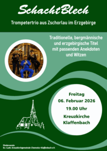 Jetzt mal eine Veranstaltung zum schmunzeln. Am Freitag nach Lichtmess (06.02.2026 19.00 Uhr) wird christlich- bergmänische Traditionspflege in der Klaffenbacher Kreuzkirche betrieben. Mit Augenzwinkern wird uns das zschorlauer Trompeten Trio „Schacht Blech“ uns durch den Abend manövrieren. Mit Gags und lustigen Anekdoten, kann man die Tagesprobleme einfach mal hinten anstellen. Kommen Sie – lauschen Sie .